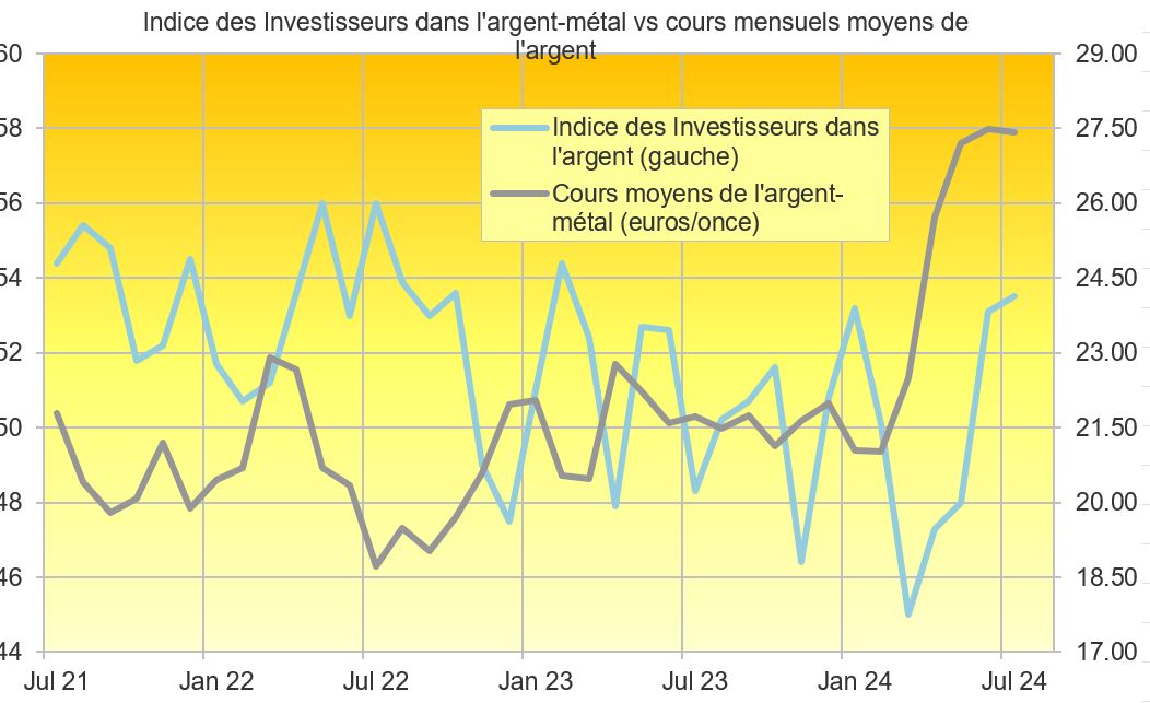 Cela a vu le nombre de personnes commençant ou augmentant leurs avoirs en argent stockés en toute sécurité au cours du mois augmenter de 17,1% sur BullionVault pour atteindre le plus haut niveau depuis mars 2023. Alors que le nombre de vendeurs nets a augmenté plus rapidement, de 20,9% par rapport au plus bas de 16 mois en juin, cela a tout de même permis à l'Indice des investisseurs en argent d'augmenter de 0,4 point pour atteindre 53,5, son plus haut niveau depuis février de l'année dernière et de dépasser l'Indice des investisseurs en or pour la première fois depuis janvier.