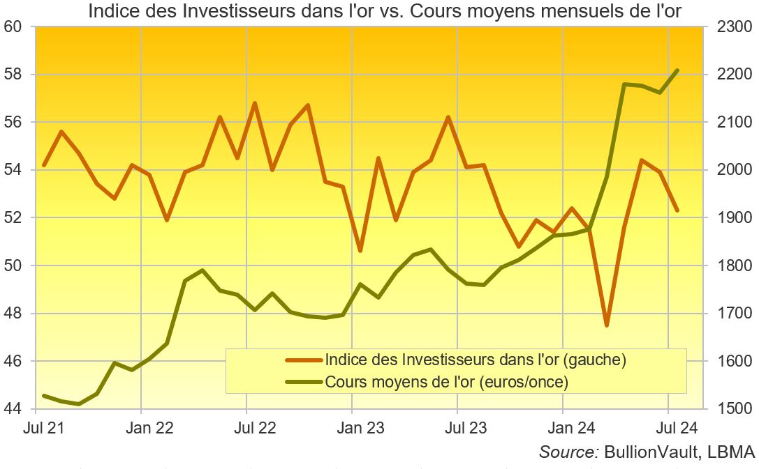L'indice des investisseurs dans l'or (Gold Investor Index), une mesure unique du sentiment des particuliers à l'égard des lingots physiques fondée uniquement sur le comportement d'investissement réel, a ainsi perdu 1,6 point pour s'établir à 52,3, soit son niveau le plus bas depuis avril.
